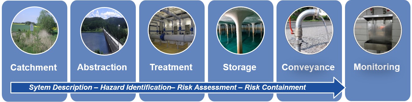 We offer support in risk management for the whole water supply chain, covering all steps from catchment area to consumers (Fig. 1). The scope and level of detail can be tailored to the water supplier’s preferences and to local requirements. The process (Fig. 2) is carried out in close coordination with the utility company involved.